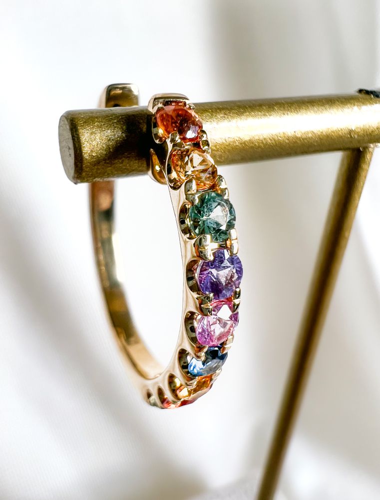 Ontdek de prachtige geelgouden oorringen van Excellent Jewelry, versierd met glinsterende rainbow saffieren. Perfect voor een speciale gelegenheid!