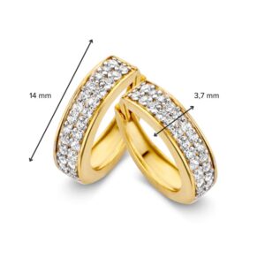 Deze creolen zijn afkomstig van het merk Excellent Jewelry dat alweer 25 jaar een toonaangevende Nederlandse sieradenleverancier en vaste partner van vele Nederlandse juweliershuizen is. Zo zijn deze oorstekers gemaakt van geelgoud van de allerbeste kwaliteit en bestaan deze uit een brede strook die aan de voorkant voorzien is van meerdere kleurloze zirkonia’s die mooi glinsteren, met een scharnier en een slanke steker die u gemakkelijk door uw oor steekt. Deze creolen hebben een breedte van 4mm met een diameter van 11mm en zijn speciaal ontworpen voor dames.