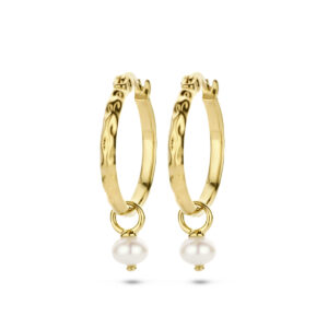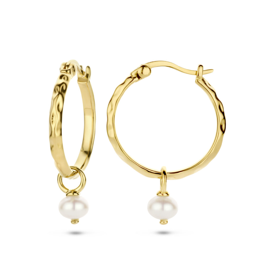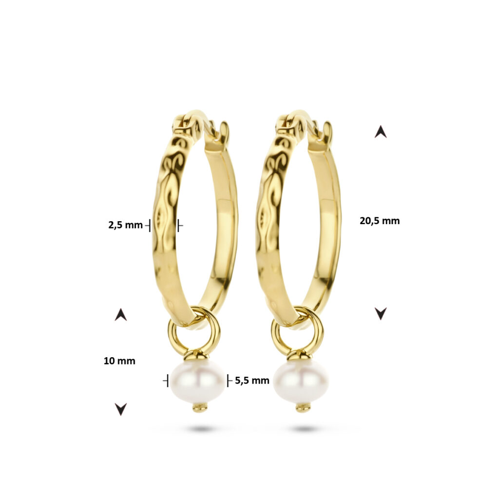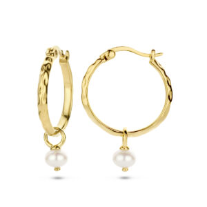 Geelgoud op 925 zilveren oorringen uitgevoerd met een schitterende parel van 5.5mm. Geen garantie op de plating.