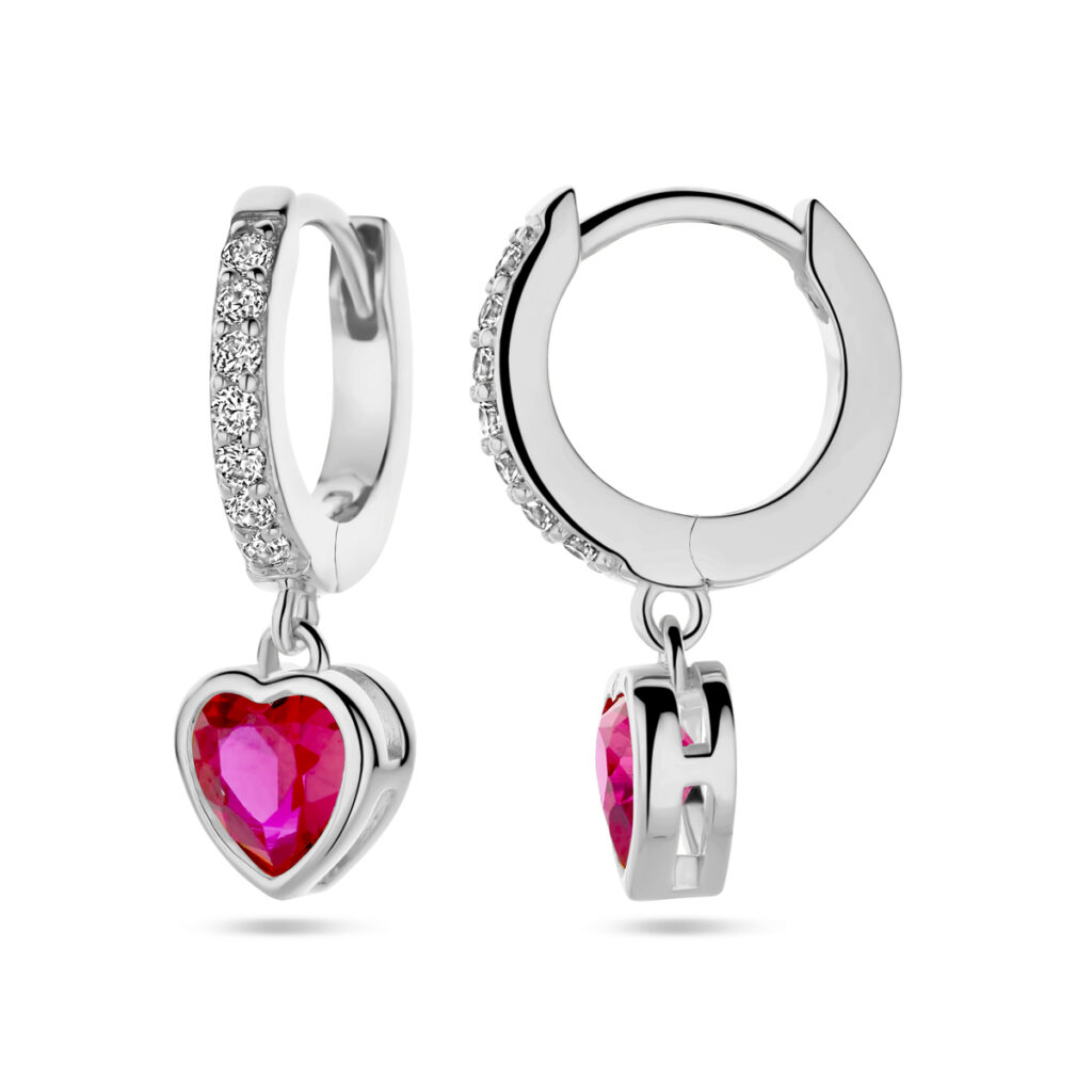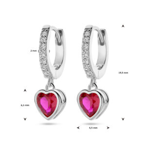 Gerhodineerd 925 zilveren oorringen uitgevoerd met een corundumkleurig zirkonia hart en wit zirkonia. De totale hoogte is 19.5mm.