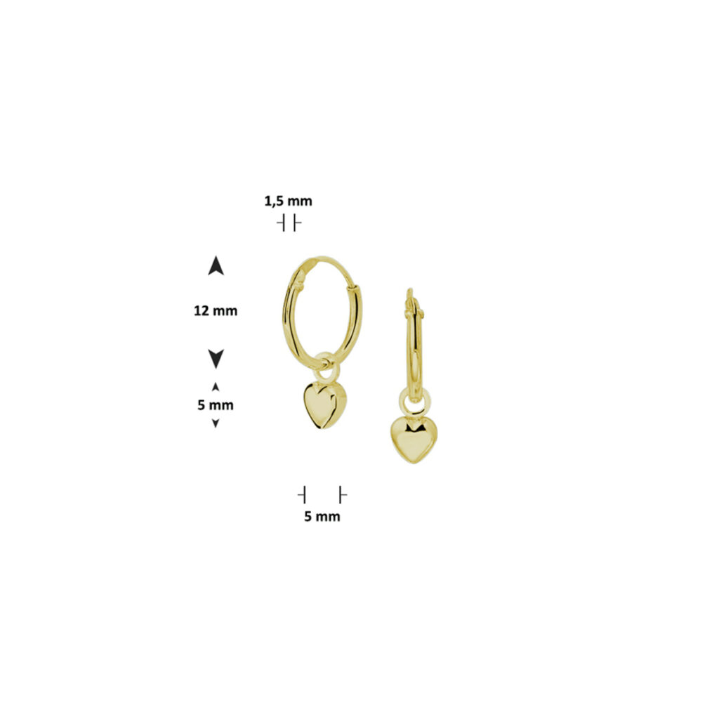 Geelgoud op zilveren oorringen met een afmeting van 12×1.5mm uitgevoerd met een hart van 5x5mm.