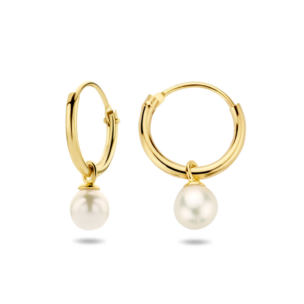 Trendy geelgouden oorringen met een schitterende zoetwaterparel. De oorringen hebben een afmeting van 11×1.3mm met een parel van 4mm. Tip: Leuk om kado te geven! De oorringen hebben een subtiele uitstraling en kunnen dagelijks gedragen worden.