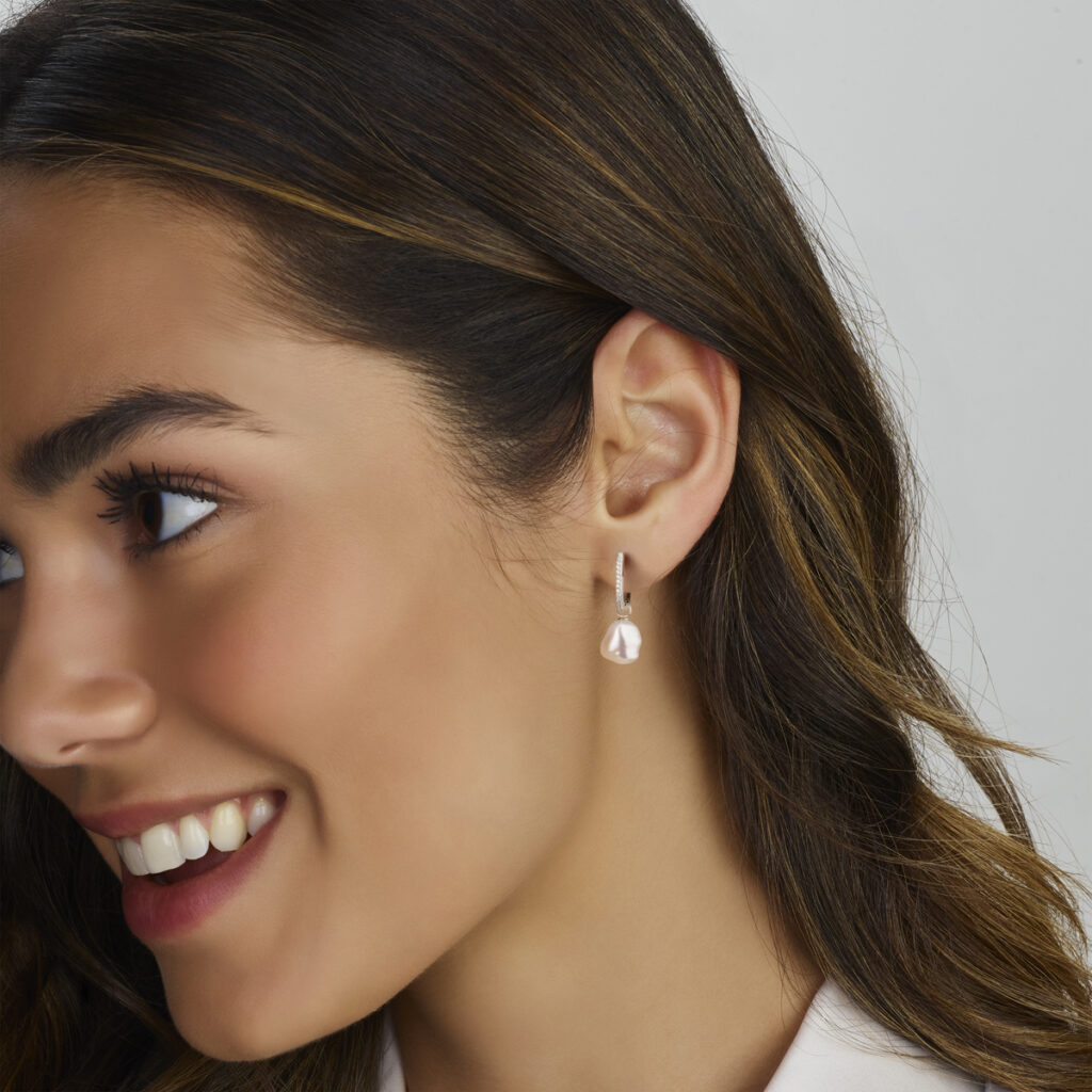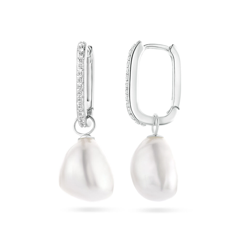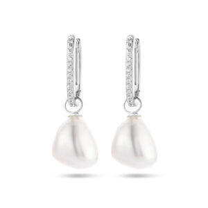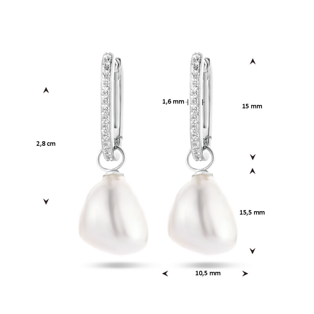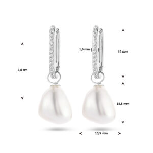 Gerhodineerd 925 zilveren oorringen uitgevoerd met zoetwaterparels en zirkonia. De oorringen hebben een totale hoogte van 28mm.