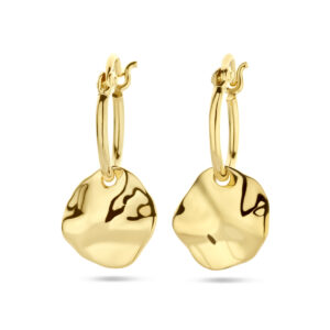 Geelgoud op 925 zilveren oorringen met een rondjes hanger. De oorringen hebben een dikte van 1.3mm.