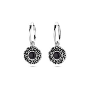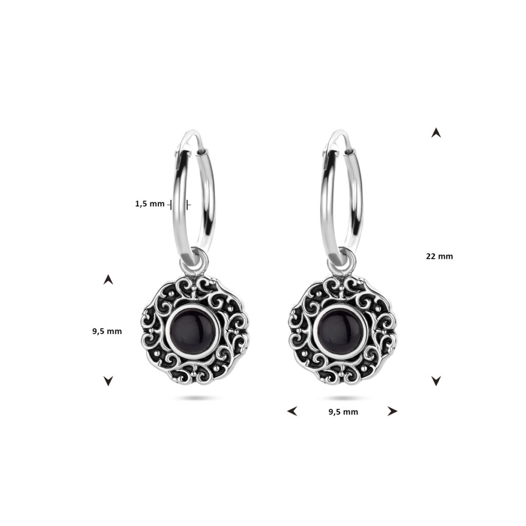Geoxideerd 925 zilveren oorringen uitgevoerd met synthetisch zwart steen. De oorringen hebben een totale hoogte van 22mm.