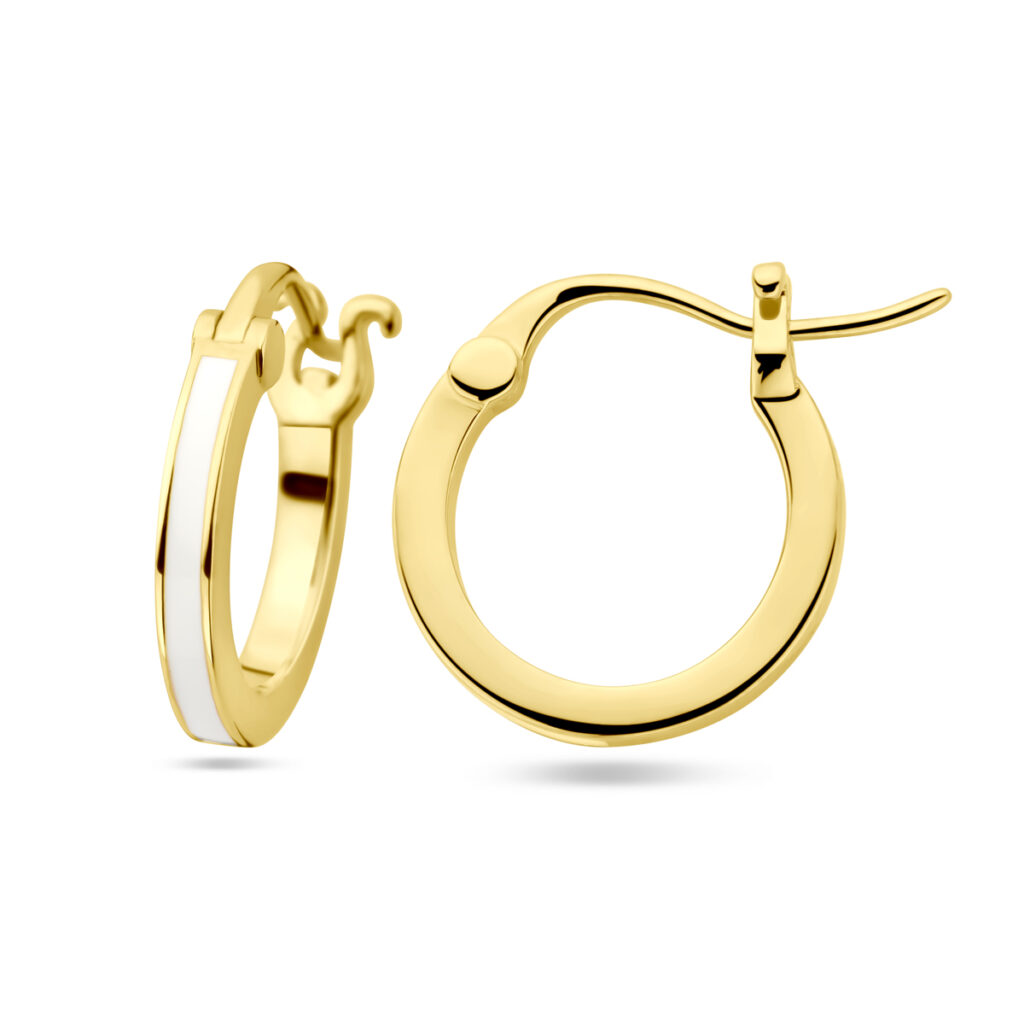 Geelgoud op 925 zilveren oorringen uitgevoerd met wit emaille. De oorringen hebben een afmeting van 15,5x2mm.