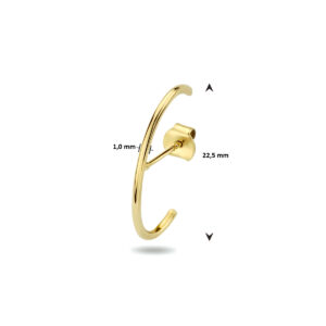 Deze leuke suspender oorbellen zijn gemaakt van 14 karaat goud, dat bestaat uit 58,5 % goud. Het sieraad is gepolijst, wat zorgt voor een mooie glanzende afwerking. Deze oorbellen vallen om je oorlel en oorschelp. De oorbellen zitten met een stekertje in het oor, hierdoor zijn ze super fijn om te dragen. De oorbellen geven een minimalistische en tegelijkertijd een chique uitstraling, daardoor staan ze bij zowel een classy look als bij een party look geweldig. De afmetingen van deze oorbellen zijn 22,5 mm hoog en 1 mm breed. De oorbellen worden per stuk verkocht.