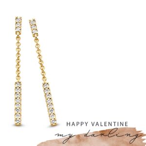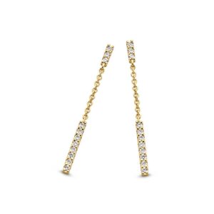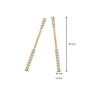 Deze oorstekers zijn afkomstig van het merk Excellent Jewelry dat alweer 25 jaar een toonaangevende Nederlandse sieradenleverancier en vaste partner van vele Nederlandse juweliershuizen is. Zo zijn deze oorstekers gemaakt van geelgoud van de allerbeste kwaliteit en bestaan deze uit een kort staafje met aan de voorkant meerdere briljanten die mooi glinsteren, met daaronder een korte schakelketting met aan het uiteinde een langwerpig staafje dat volledig is bezet met meerdere kleurloze briljanten die mooi glinsteren. De briljanten hebben een totaal karaatgehalte van 0,12 crt. Deze oorstekers hebben een lengte van 15mm met een breedte van 1,5mm en een gewicht van 1,0 gram.