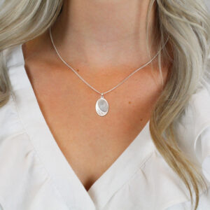 Deze ovale hanger met vingerafdruk en tekst is gemaakt van 925 sterling zilver, de allerbeste kwaliteit zilver, met een fijntjes gepolijst oppervlak dat mooi glanst. Deze hanger bestaat uit een slank oogje waar u gemakkelijk een ketting naar keuze doorheen haalt, met daaronder een ovaalvormig plaatje met bovenaan ruimte voor een gravering van een vingerafdruk, met daaronder ruimte voor een korte tekst in uw eigen handschrift of uiteraard het handschrift van een geliefde. Zo bent u verzekerd van een persoonlijk en uniek sieraad. Deze hanger heeft een afmeting van 16x22mm met een dikte van 0,7mm.