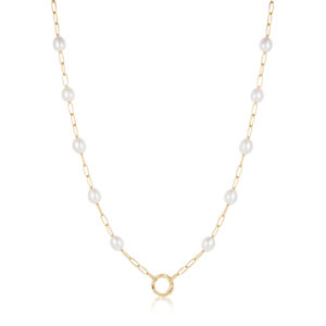 Een nieuwe manier om de geliefde pareltrend in te zetten. Probeer deze prachtige bedelketting met parels, perfect om gewoon te dragen of om je gekozen bedels uit de Pop Charms-collectie aan toe te voegen. Een trendy gouden schakelketting en iriserende parels, afgewerkt met een zirkonia bezette schakel. Maak je look af met klassieke of opvallende bedels die je gemakkelijk bevestigd aan de connector.