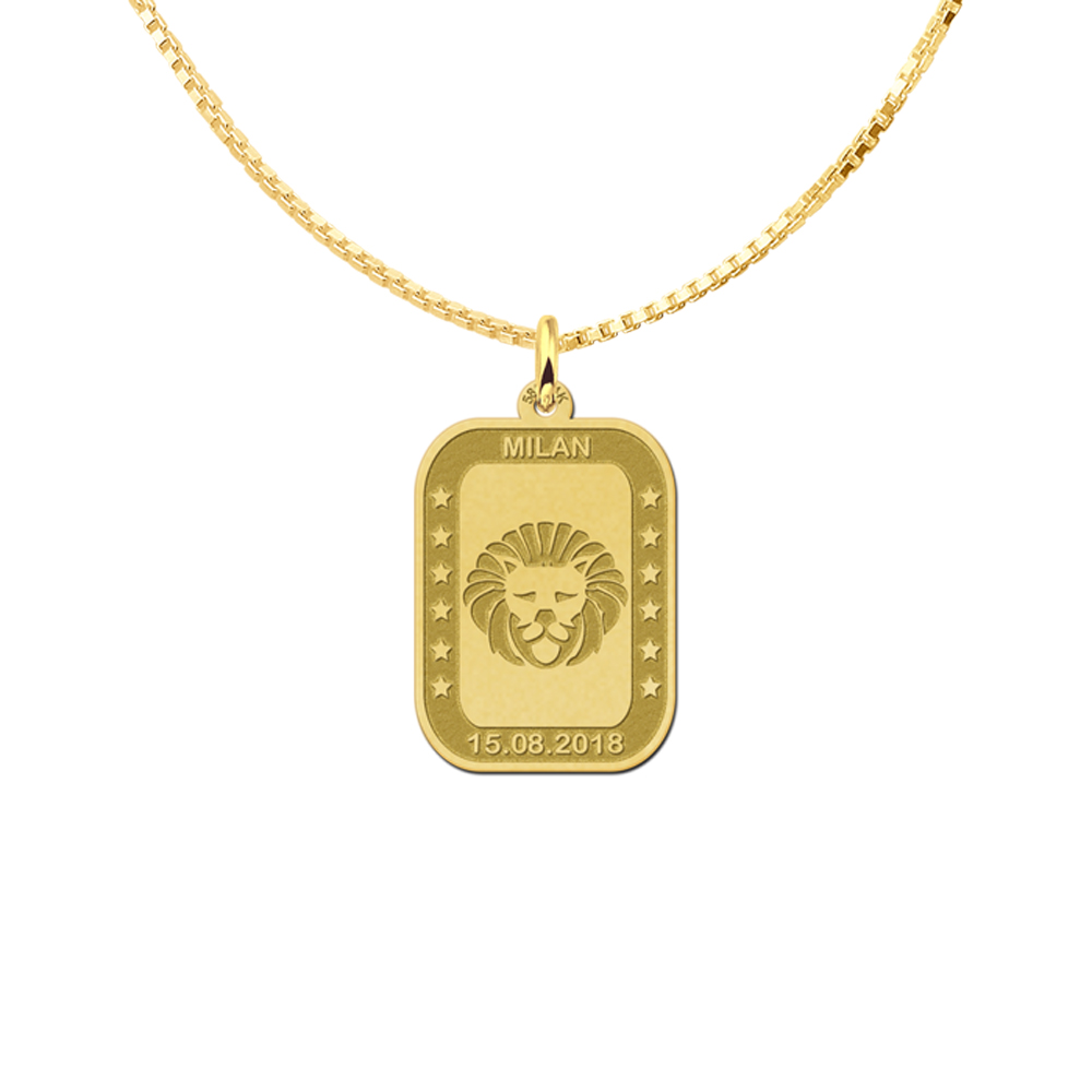 Deze rechthoekige hanger is volledig gemaakt van 14 karaats goud, de allerbeste kwaliteit goud, met een fijntjes gepolijst oppervlak dat mooi glanst alsook een gematteerde bewerking. Deze hanger bestaat uit een slank oogje waar u gemakkelijk een ketting naar keuze doorheen haalt, met daaronder een rechthoekige hanger met sterk geronde hoeken die voorzien is van een gematteerde rand met bovenin en onderin ruimte voor twee te graveren namen naar keuze die gepolijst geplaatst zal worden, met aan weerszijden zes gepolijste sterretjes. In het midden zit een gepolijst oppervlak met een matte en gestileerde weergave van een leeuw. Deze hanger is zeer leuk voor iedereen die geboren is tussen 23 juli en 23 augustus. De hanger heeft een afmeting van 16,8×22,8mm met een dikte van 0,4mm. Vergeet vooral niet om een mooie bijpassende ketting te bestellen zodat u deze hanger meteen kunt dragen!