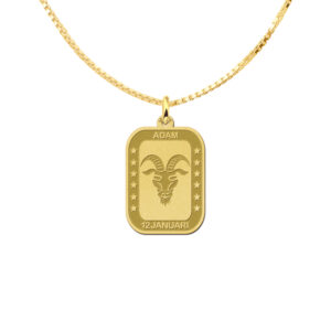 Deze rechthoekige hanger is volledig gemaakt van 14 karaats goud, de allerbeste kwaliteit goud, met een fijntjes gepolijst oppervlak dat mooi glanst alsook een gematteerde bewerking. Deze hanger bestaat uit een slank oogje waar u gemakkelijk een ketting naar keuze doorheen haalt, met daaronder een rechthoekige hanger met sterk geronde hoeken die voorzien is van een gematteerde rand met bovenin en onderin ruimte voor twee te graveren namen naar keuze die gepolijst geplaatst zal worden, met aan weerszijden zes gepolijste sterretjes. In het midden zit een gepolijst oppervlak met een matte en gestileerde weergave van een steenbok. Deze hanger is zeer leuk voor iedereen die geboren is tussen 22 december en 19 januari. De hanger heeft een afmeting van 16,8×22,8mm met een dikte van 0,4mm. Vergeet vooral niet om een mooie bijpassende ketting te bestellen zodat u deze hanger meteen kunt dragen!