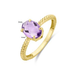 14k Geelgouden ring uitgevoerd met amethist. De steen heeft een afmeting van 8x6mm.