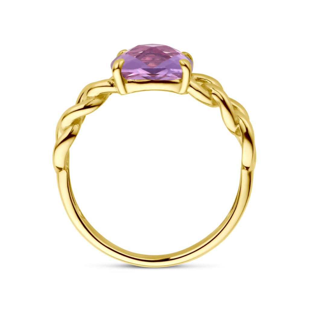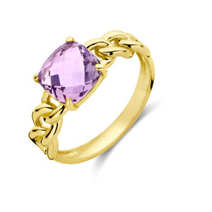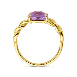 14k Geelgouden ring met schakelmotief, uitgevoerd met een amethist. De ring heeft een breedte van 8mm.