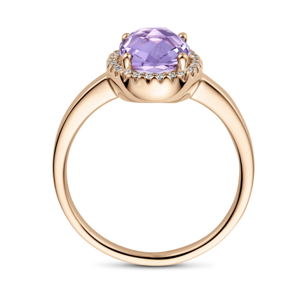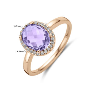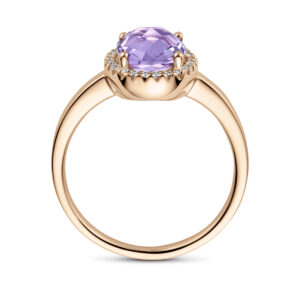 14k Roségouden ring uitgevoerd met amethist en diamant. De ring heeft een afmeting van 11.5×9.5mm. Het diamantgewicht is 0.10ct.