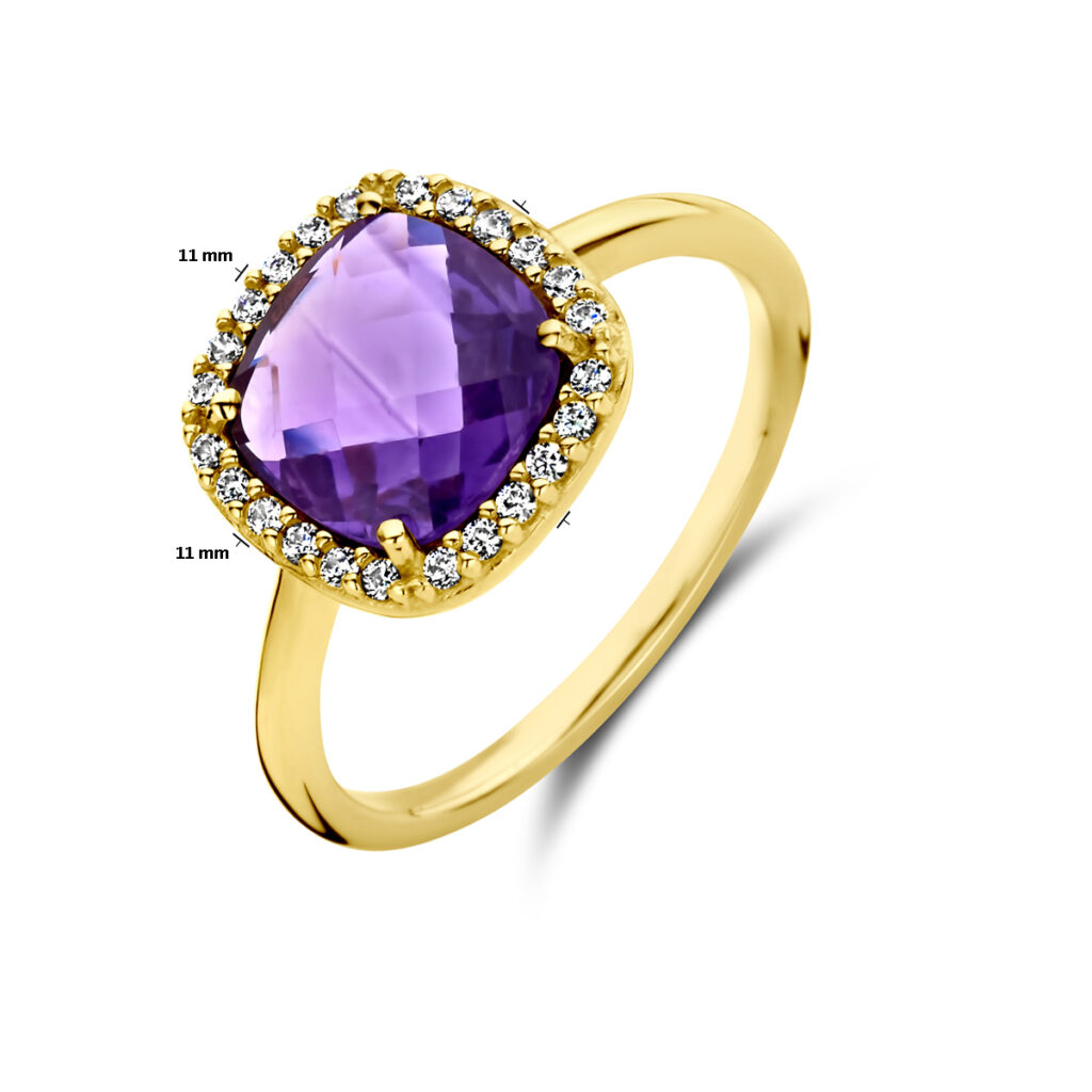 14k Geelgouden ring uitgevoerd met amethist en zirkonia. De ring heeft een breedte van 11mm.