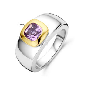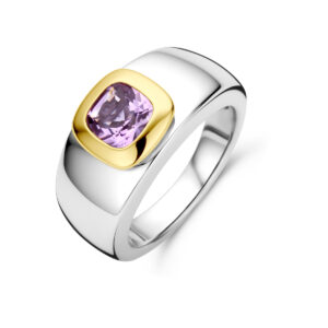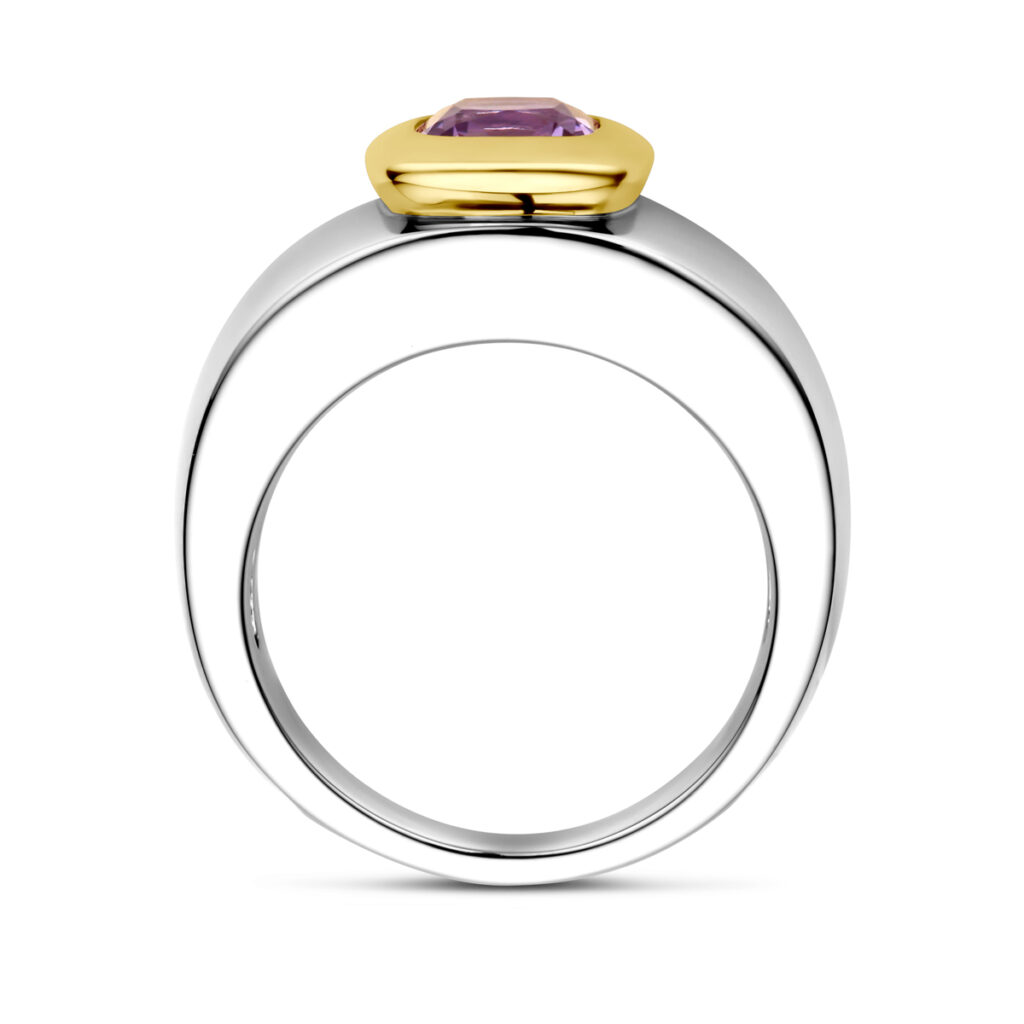 14k Geelgoud met gerhodineerd 925 zilveren ring uitgevoerd met amethist. De breedte is 8.7mm.