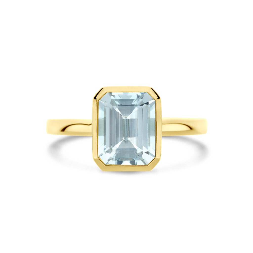 14k Geelgouden ring uitgevoerd met aquamarijn. De ring heeft een breedte van 10mm.