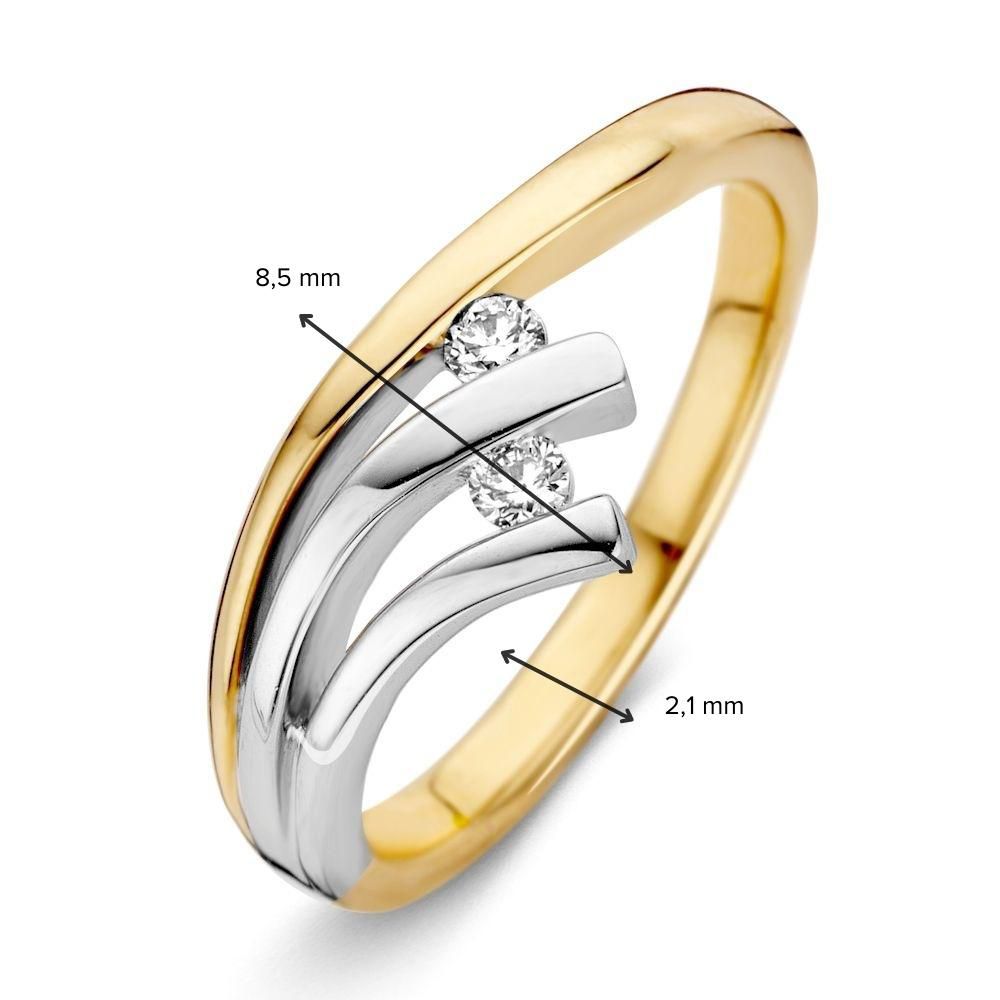 Deze ring is afkomstig van het merk Excellent Jewelry dat alweer 25 jaar een toonaangevende Nederlandse sieradenleverancier en vaste partner van vele Nederlandse juweliershuizen is. De ring is gemaakt van geelgoud met witgoud van de allerbeste kwaliteit en bestaat uit een slanke strook geelgoud die aan de voorkant voorzien is van twee afsplitsende witgouden stroken waarbij ook nog eens twee kleurloze diamanten zijn geplaatst. De diamanten hebben een totaal karaatgehalte van 0,10 crt. en zijn voorzien van een briljante slijpvorm met een SI-1 helderheid. Deze ring is speciaal ontworpen voor dames en is uiteraard verkrijgbaar in diverse ringmaten.