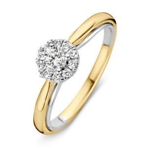 Deze ring is afkomstig van het merk Excellent Jewelry dat alweer 25 jaar een toonaangevende Nederlandse sieradenleverancier en vaste partner van vele Nederlandse juweliershuizen is. De ring is gemaakt van geelgoud met witgoud van de allerbeste kwaliteit en bestaat uit een slanke bolstaande strook geelgoud die op diverse plekken voorzien is van witgouden stukjes, met aan de voorkant een rond kopstuk van witgoud dat voorzien is van meerdere kleurloze diamanten die mooi glinsteren. Deze diamanten hebben een totaal karaatgehalte van 0,33 crt. met een briljante slijpvorm en een SI-1 helderheid. Deze ring heeft een gewicht van 3,1 gram met een breedte van 7,2mm en is uiteraard verkrijgbaar in diverse ringmaten.