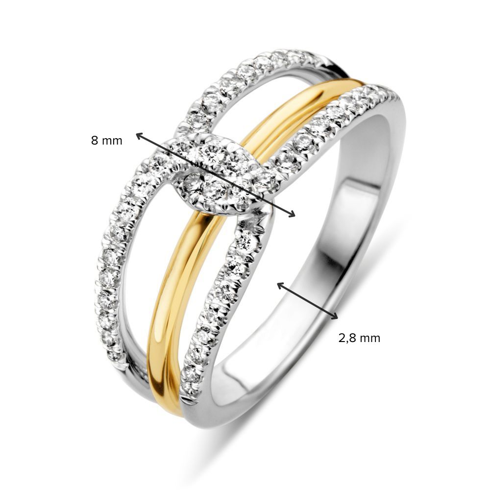 Deze ring is afkomstig van het merk Excellent Jewelry dat alweer 25 jaar een toonaangevende Nederlandse sieradenleverancier en vaste partner van vele Nederlandse juweliershuizen is. De ring bestaat uit een slanke strook witgoud die aan de voorkant breder loopt en opsplitst in gelijke stroken die door elkaar gehaakt zijn, met in het midden een geelgouden strook. De witgouden stroken zijn aan de voorkant voorzien van meerdere kleurloze diamanten die mooi glinsteren. De diamanten hebben een totaal karaatgehalte van 0,37 crt. met een SI-1 helderheid en een briljante slijpvorm. Deze ring heeft een gewicht van 4,4 gram met een breedte van 8mm en is uiteraard beschikbaar in diverse ringmaten.