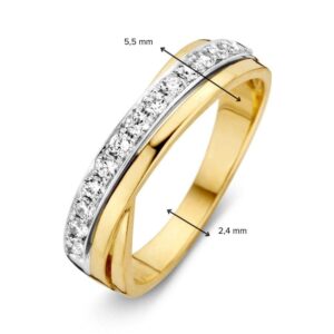 Deze ring is afkomstig van het merk Excellent Jewelry dat alweer 25 jaar een toonaangevende Nederlandse sieradenleverancier en vaste partner van vele Nederlandse juweliershuizen is. De ring is gemaakt van geelgoud van de allerbeste kwaliteit en bestaat uit een geelgouden strook die naar de voorkant breder loopt en aan de voorkant ook nog eens voorzien is van een witgouden strook die diagonaal over de voorkant van de ring is geplaatst. Deze witgouden strook is voorzien van meerdere kleurloze zirkonia’s die mooi glinsteren. De ring is aan de binnenzijde voorzien van een vlakke afwerking voor optimaal draagcomfort. Deze ring heeft een gewicht van 3,7 gram met een breedte van 5,5mm en is uiteraard verkrijgbaar in diverse ringmaten.