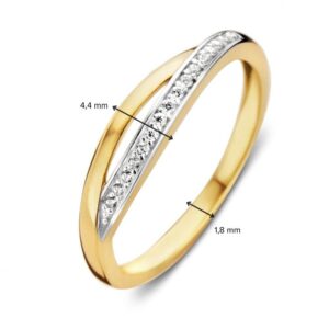 Deze ring is afkomstig van het merk Excellent Jewelry dat alweer 25 jaar een toonaangevende Nederlandse sieradenleverancier en vaste partner van vele Nederlandse juweliershuizen is. De ring is gemaakt van geelgoud met witgoud van de allerbeste kwaliteit en bestaat uit een slanke strook geelgoud die aan de voorkant opsplitst in twee gelijke stroken die langs elkaar bewegen en weer aansluiten, waardoor er een opengewerkt vlak aan de voorkant ontstaat. Eén van de twee stroken is voorzien van een strook witgoud met daarop meerdere kleurloze zirkonia’s die mooi glinsteren. Deze ring heeft een gewicht van 1,8 gram met een breedte van 4,4mm en is uiteraard verkrijgbaar in diverse ringmaten.