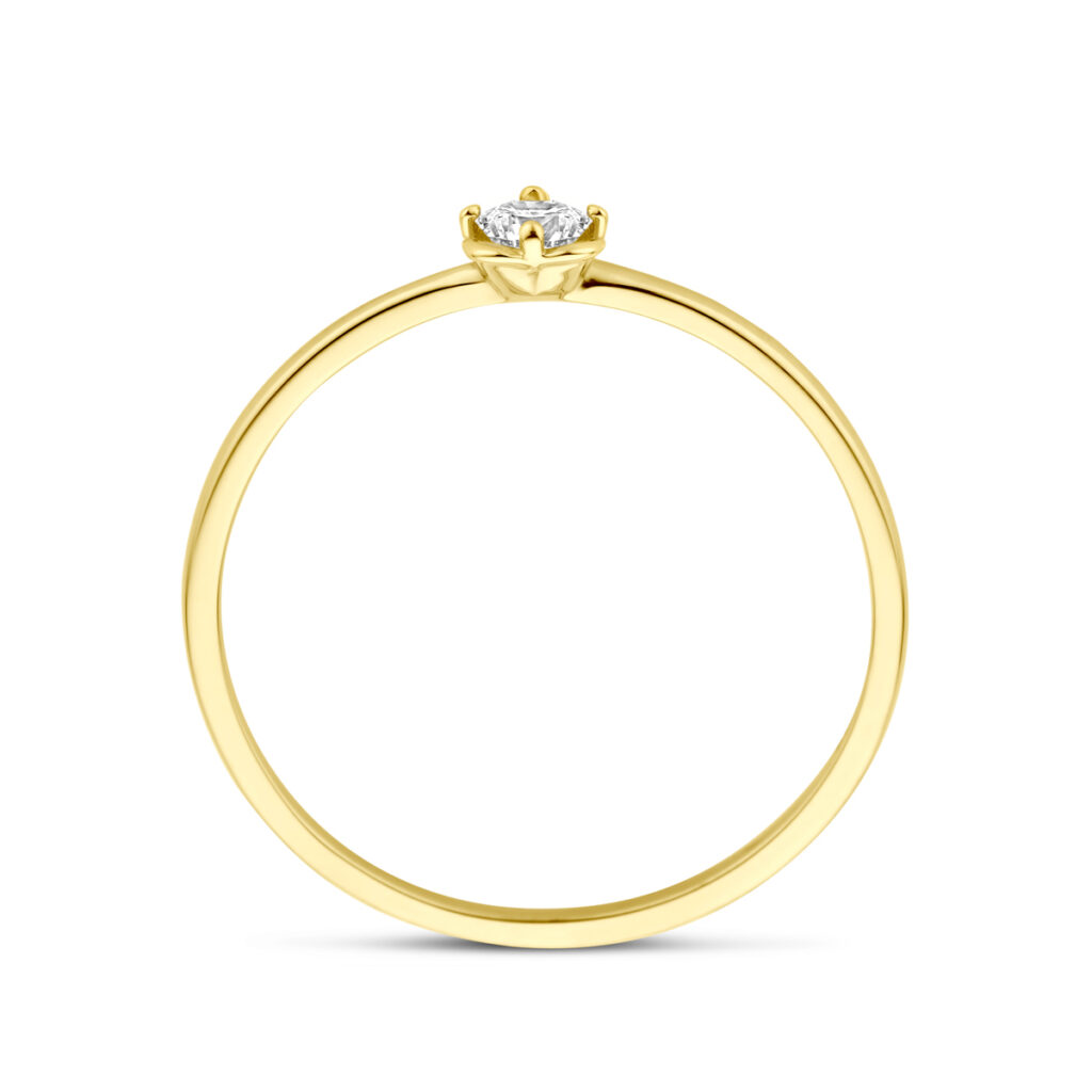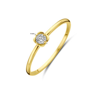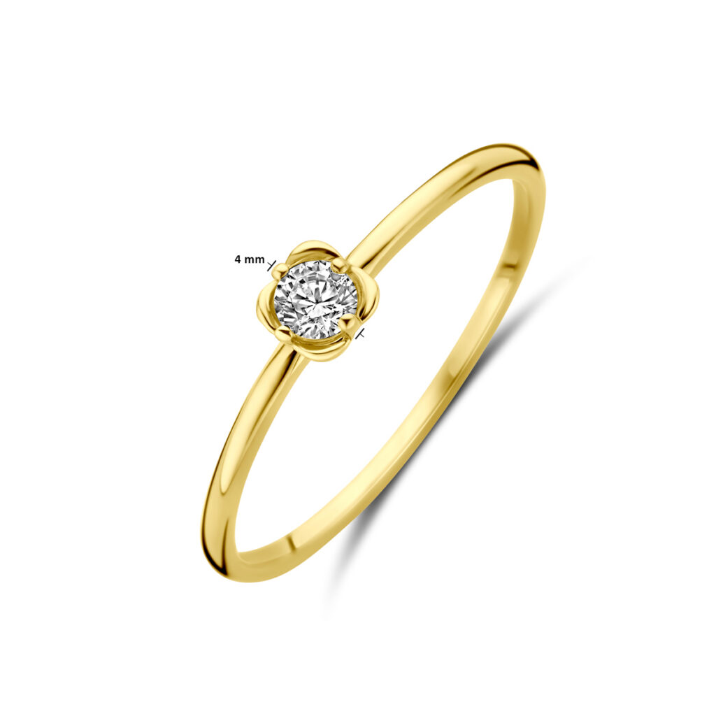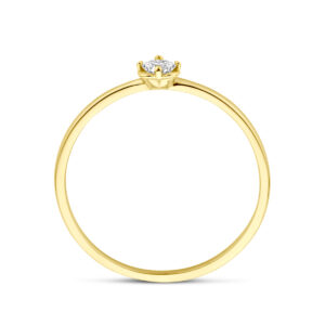 14k Geelgouden ring uitgevoerd in de vorm van een bloem met zirkonia. De ring heeft een breedte van 4mm.