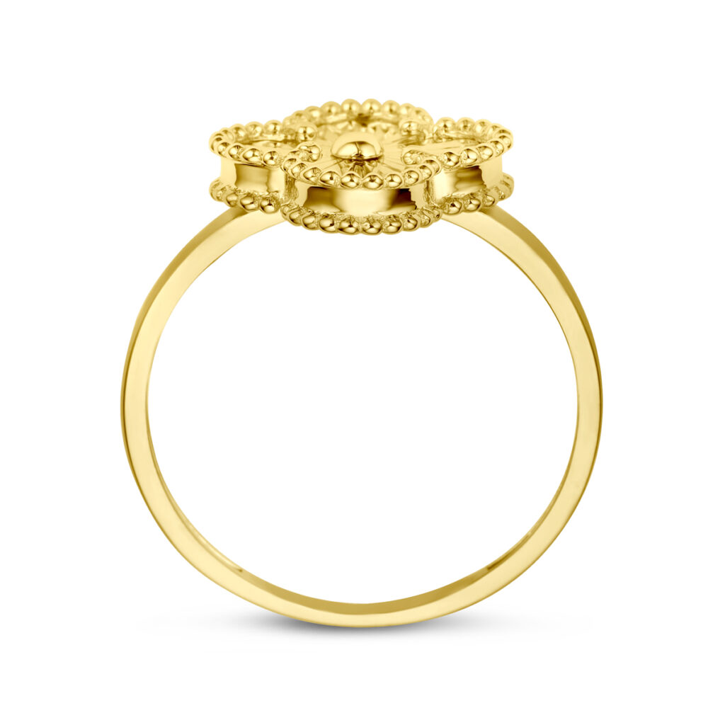 14k Geelgouden ring uitgevoerd met een bloem. De ring heeft een breedte van 12mm.