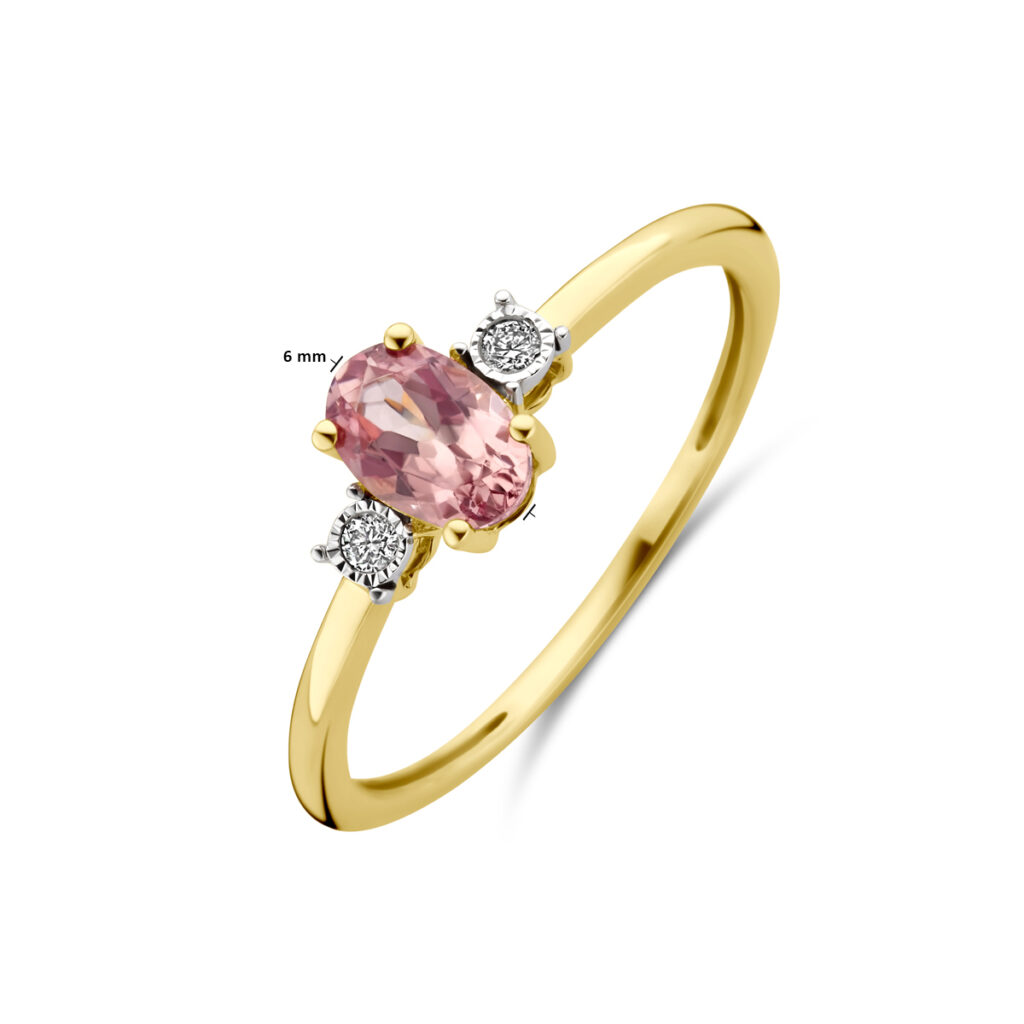 14k Geelgouden ring uitgevoerd met champagne granaat en diamant. De ring heeft een afmeting van 6x4mm. De totale diamantgewicht is 0.03ct.
