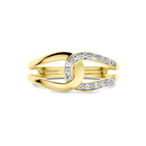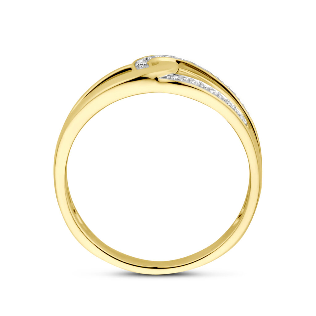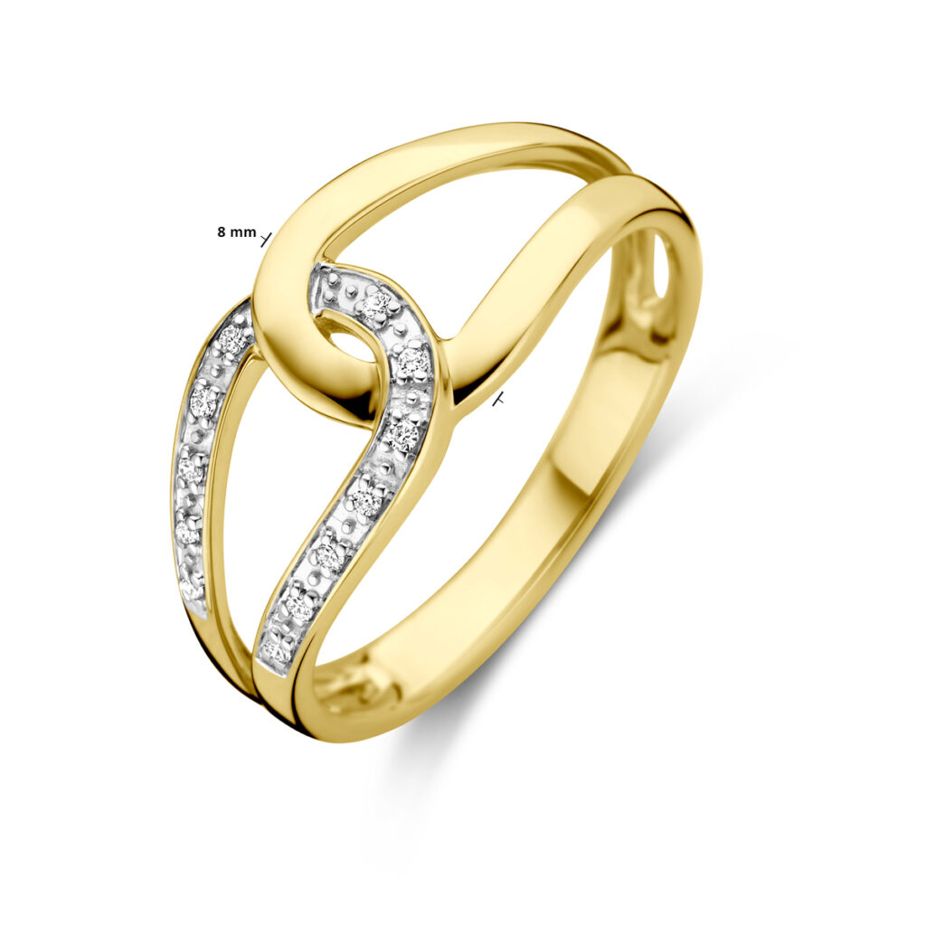 14k Geelgouden ring uitgevoerd met diamant. De ring heeft een breedte van 8mm. De totale diamantgewicht is 0.03ct.
