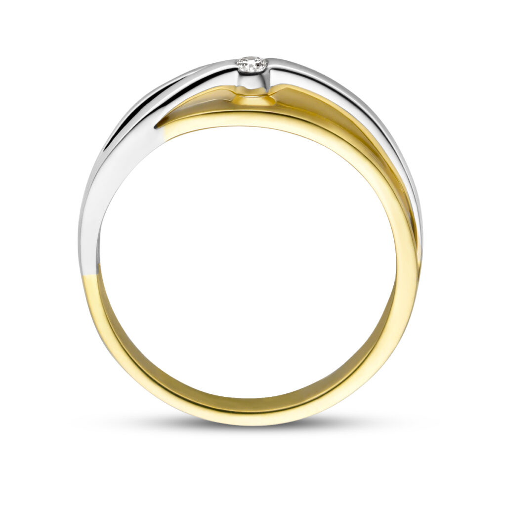 14k Bicolor geel- en witgouden ring uitgevoerd met een schitterende diamant. De ring heeft een breedte van 6.5mm. De totale diamantgewicht is 0.04ct.