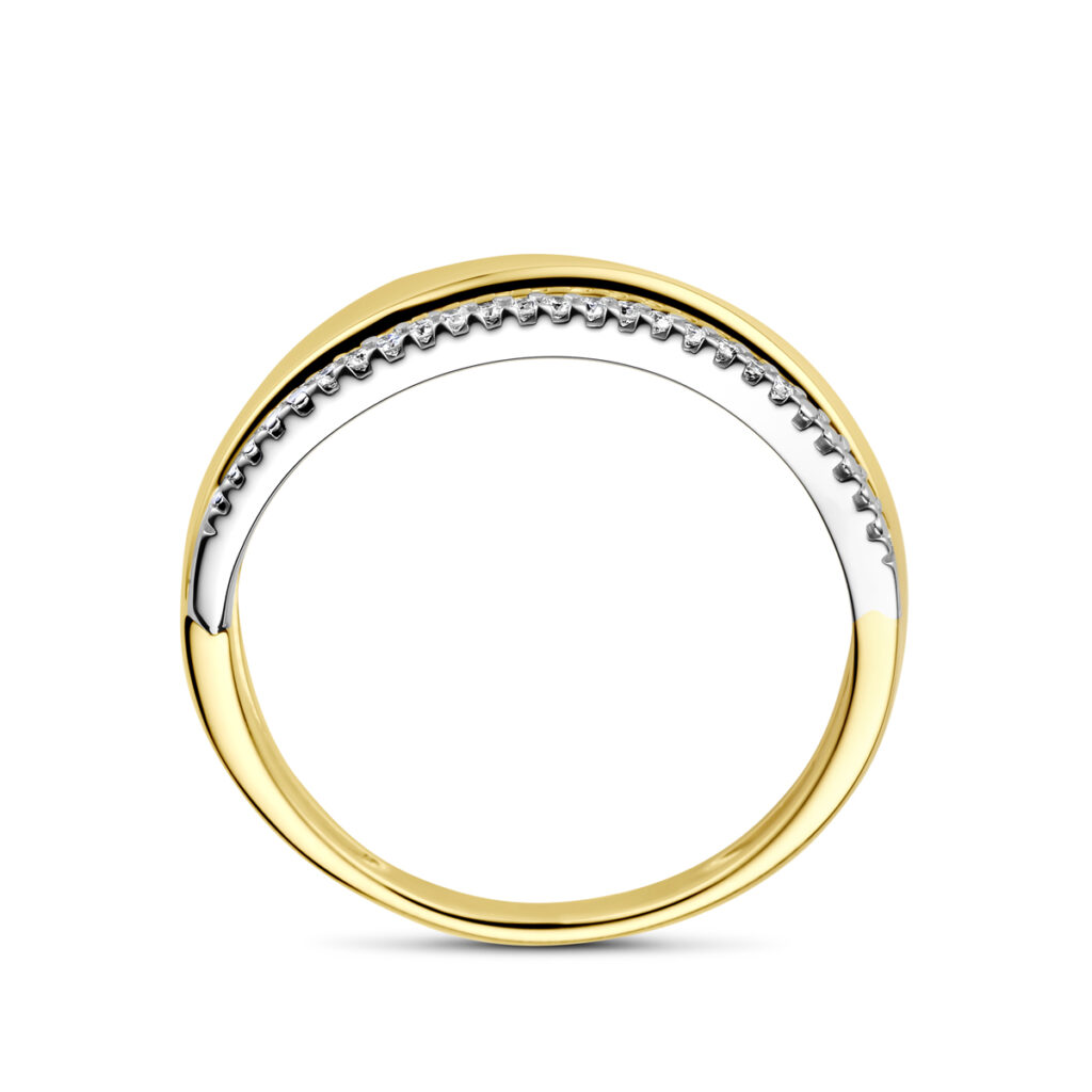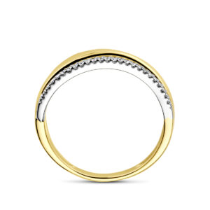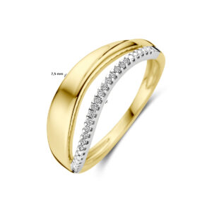 14k Bicolor wit- en geelgouden ring uitgevoerd met diamant. De ring heeft een breedte van 7.5mm. Het diamantgewicht is 0.06ct.