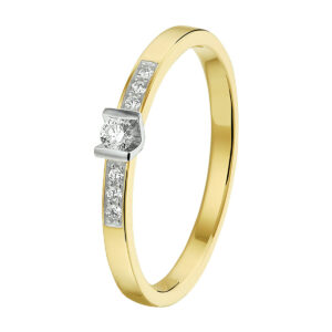 14k Bicolor geel- en witgouden ring uitgevoerd met een diamant rij. De ring heeft een breedte van 2.5mm en de solitair diamant heeft een diamantgewicht van 0.05ct.