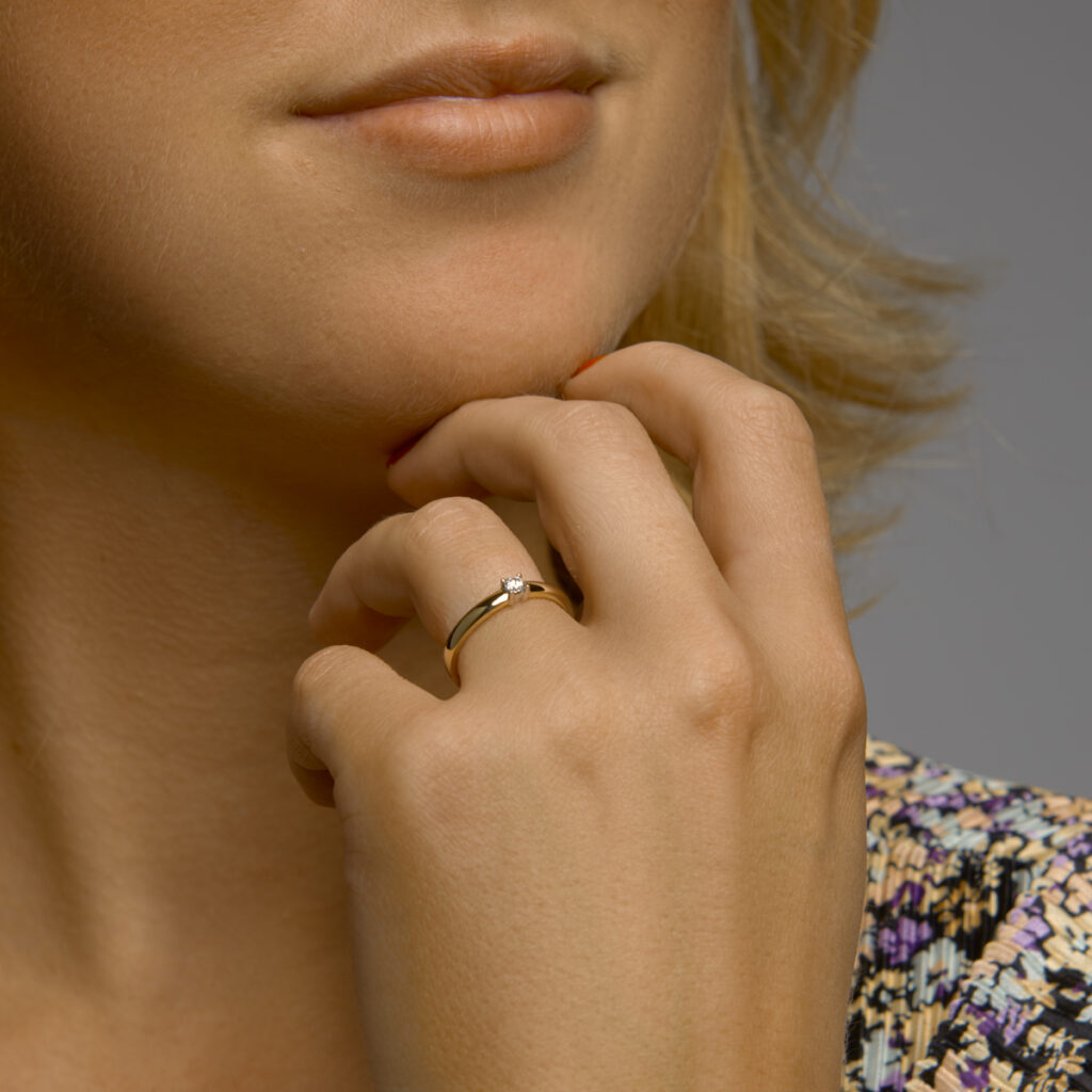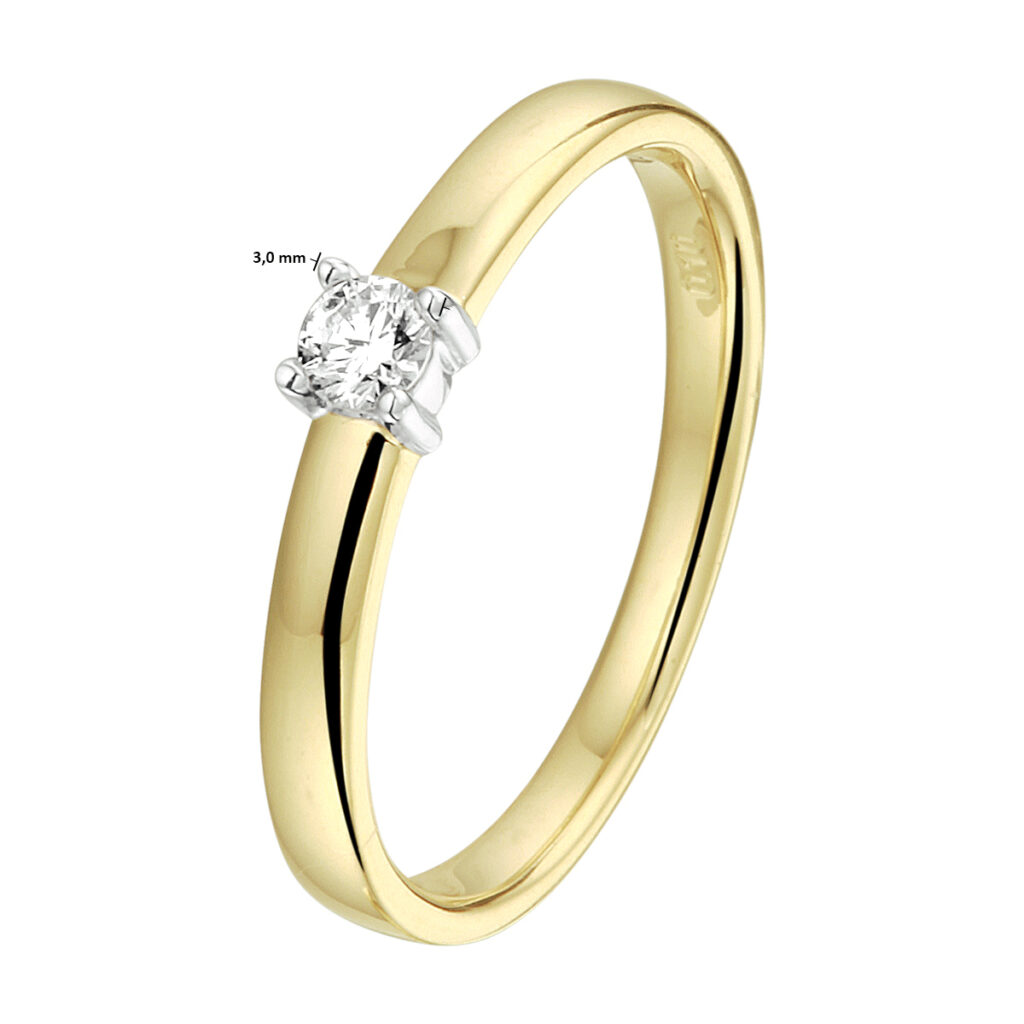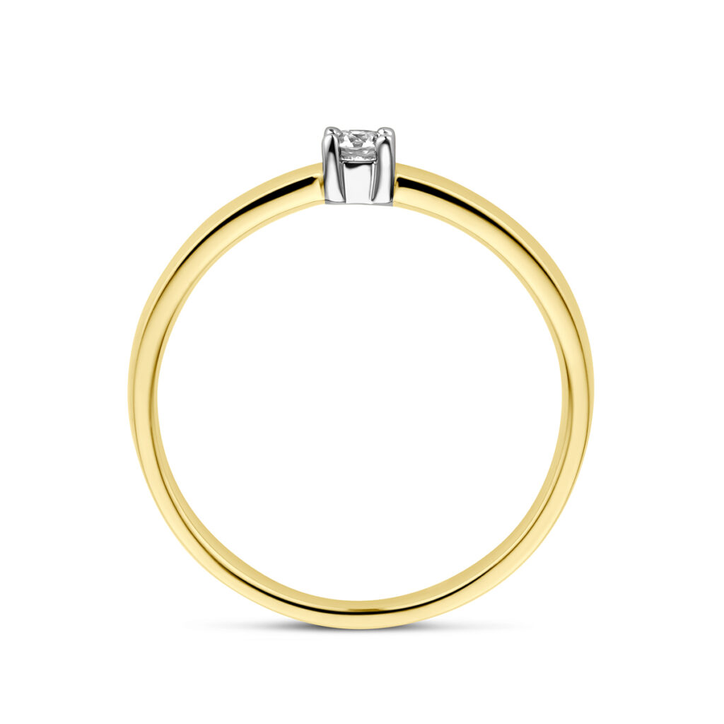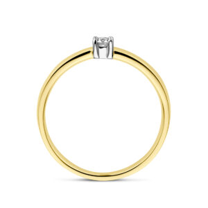 14k Bicolor geel- en witgouden ring uitgevoerd met een schitterende diamant. De ring heeft een breedte van 3mm.