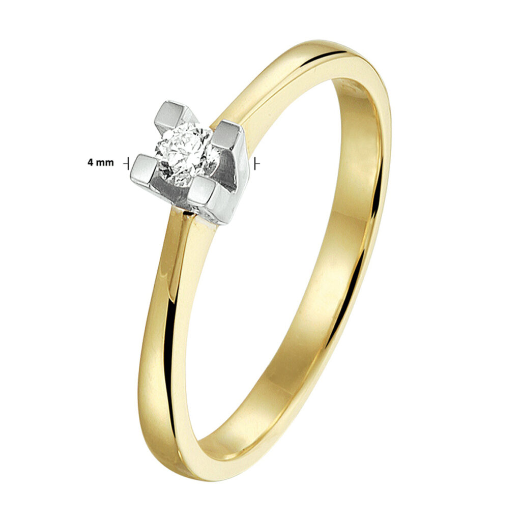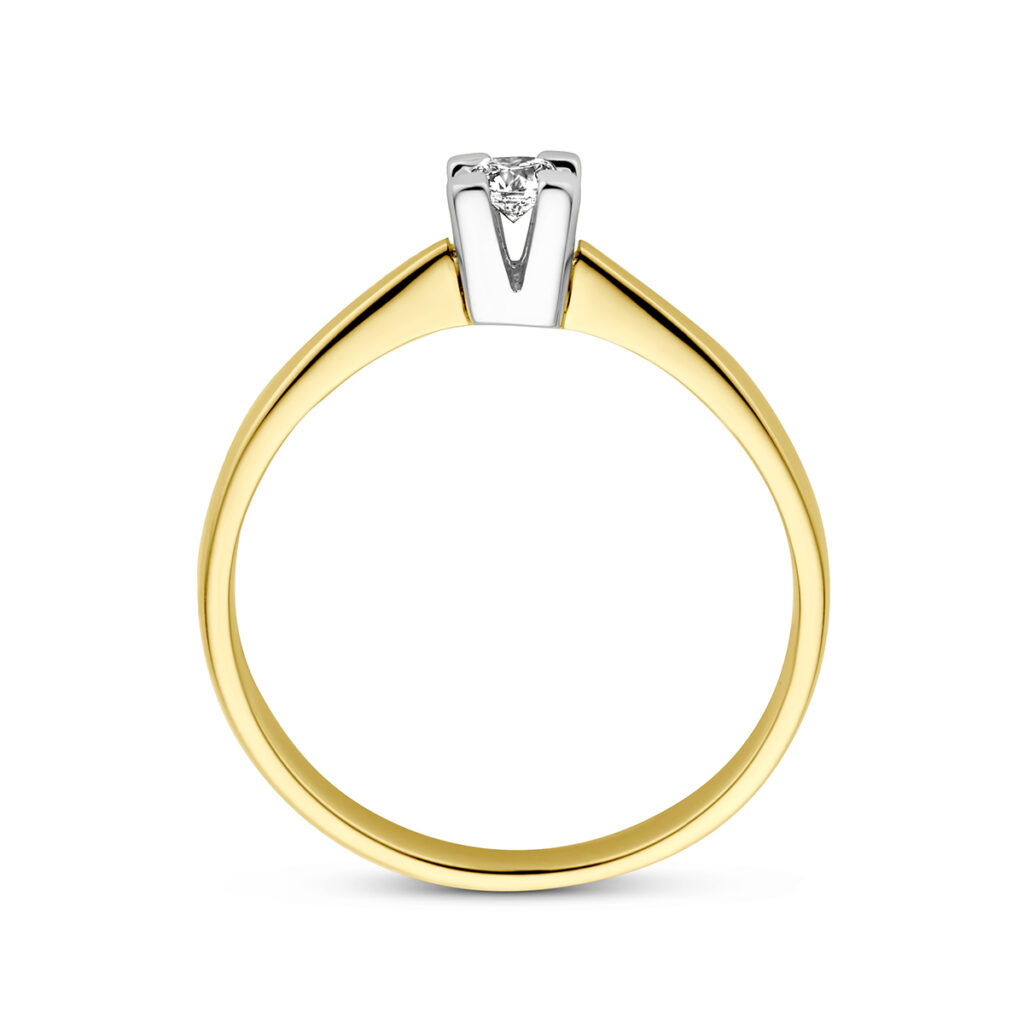 Luxe bicolor geel- en witgouden ring met een breedte van 4mm uitgevoerd met een briljant geslepen diamant van 0.10ct. Tip: Perfect kado voor dierbare of geliefde! Diamonds are girls best friend!