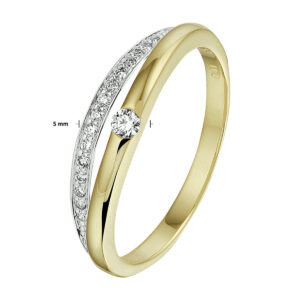 14k Bicolor geel- en witgouden ring uitgevoerd met schitterende diamanten. De ring heeft een breedte van 5mm.
