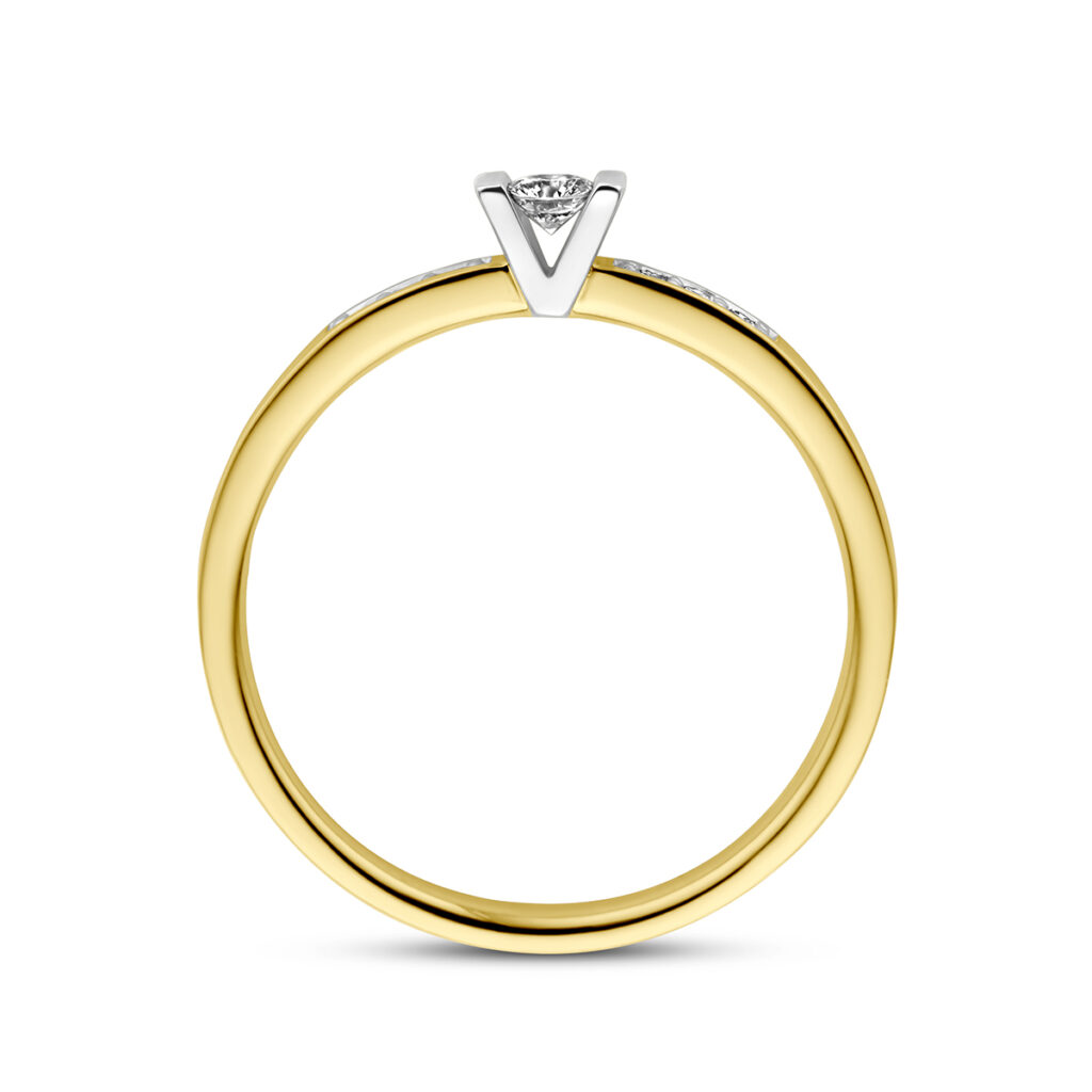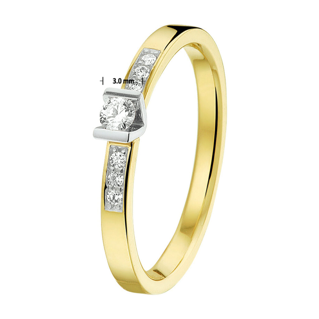 14k Bicolor geel- en witgouden ring uitgevoerd met een diamant rij. De ring heeft een breedte van 3.0mm en de solitair diamant heeft een diamantgewicht van 0.075ct.