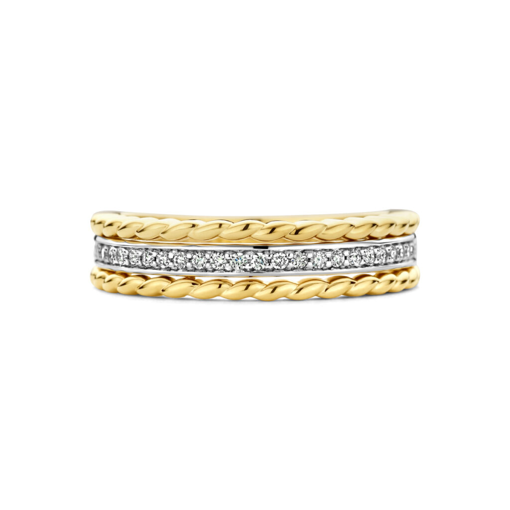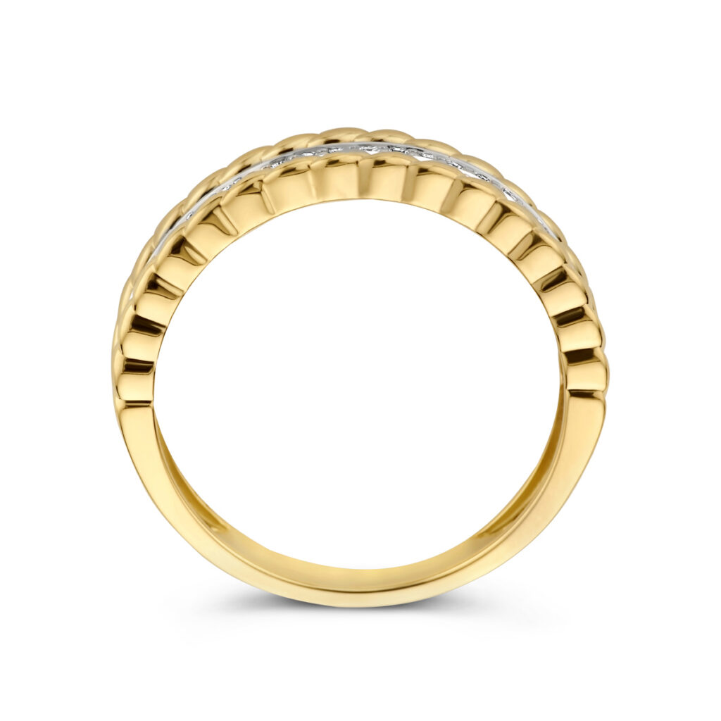 14k Bicolor geel- en witgouden ring uitgevoerd met een diamant rij. De ring heeft een breedte van 5mm.