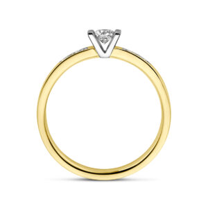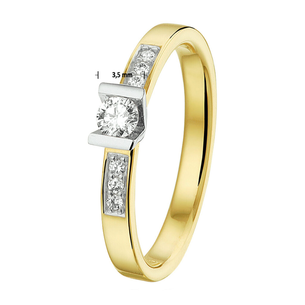 14k Bicolor geel- en witgouden ring uitgevoerd met een diamant rij. De ring heeft een breedte van 3.5mm en de solitair diamant heeft een diamantgewicht van 0.14ct.