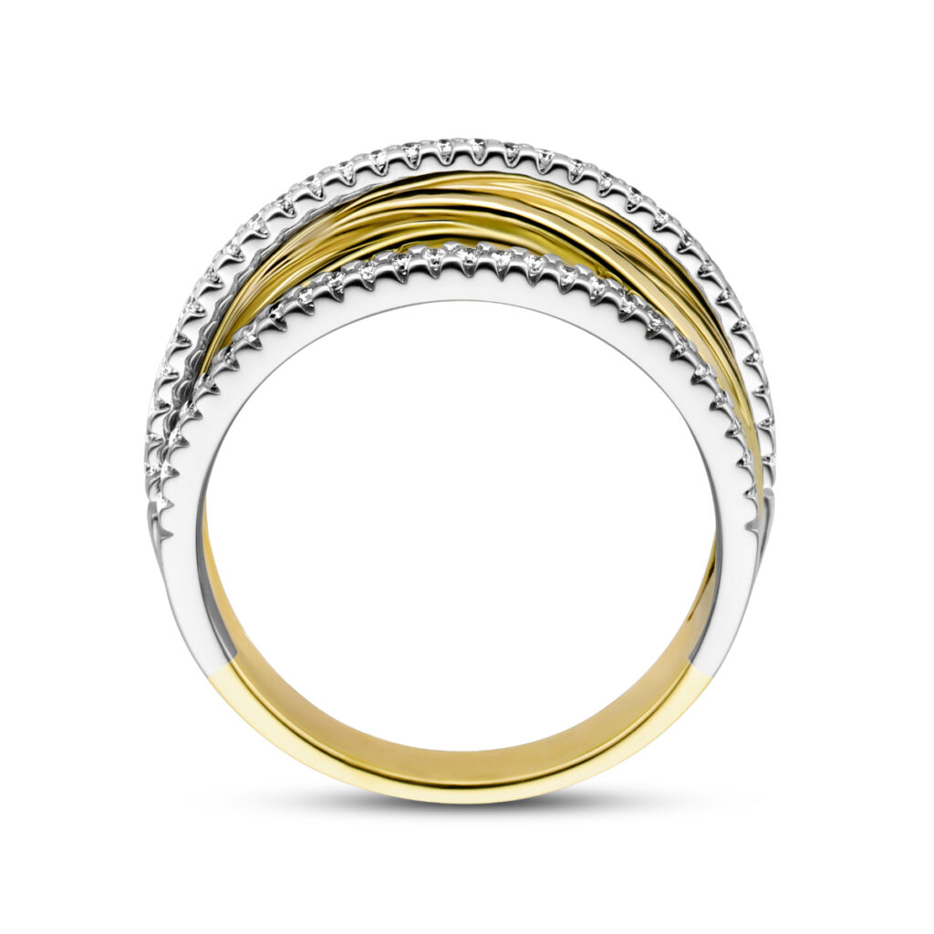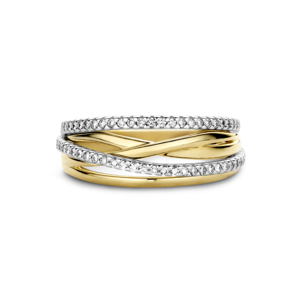 14k Bicolor geel- en witgouden ring uitgevoerd met diamanten. De ring heeft een breedte van 8mm.
