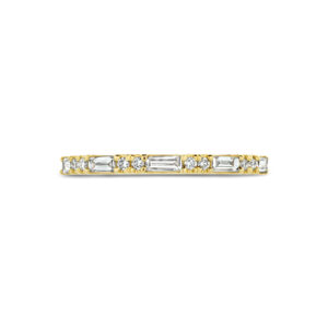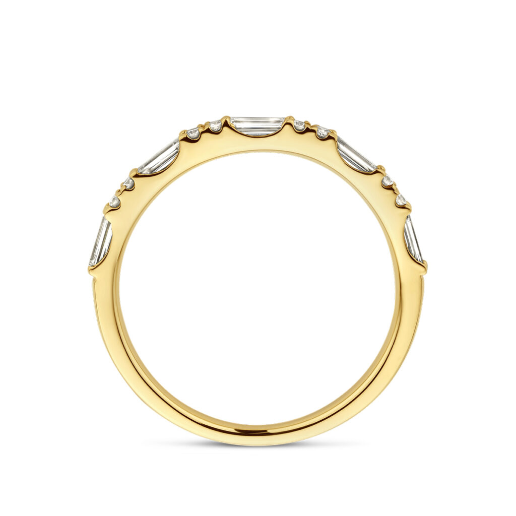 14k Geelgouden ring uitgevoerd met diamanten. De ring heeft een breedte van 2mm.