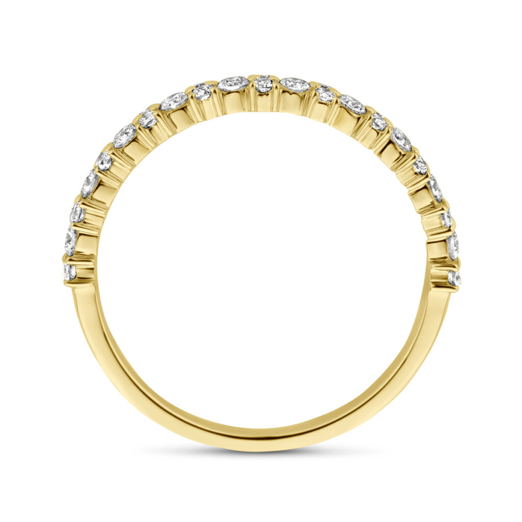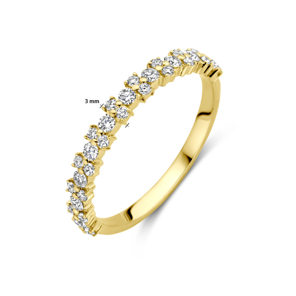 14k Geelgouden ring uitgevoerd met schitterende diamant. De ring heeft een breedte van 3mm. Het diamantgewicht is 0.44ct.