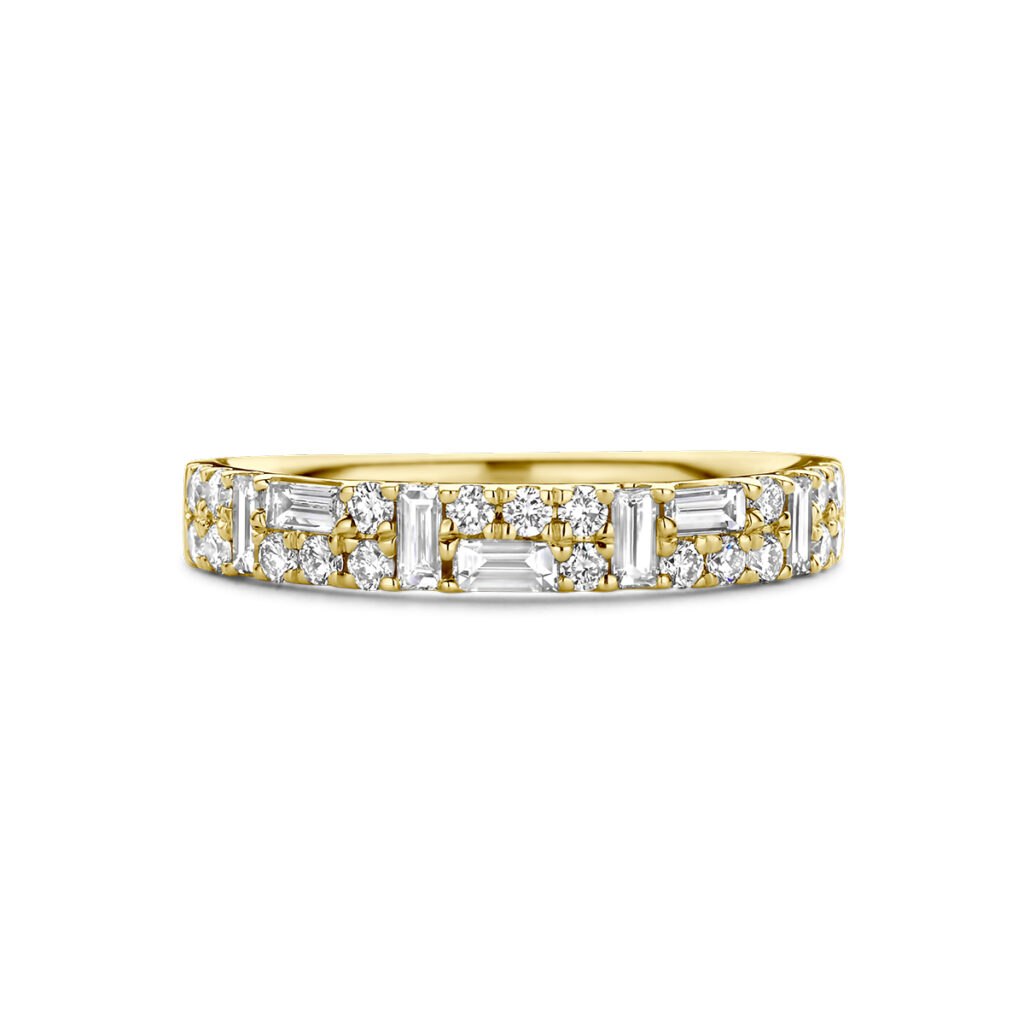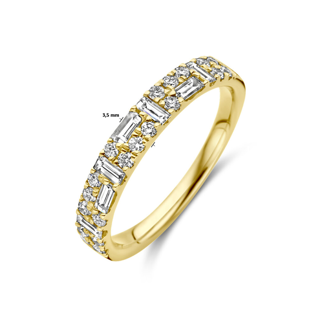 14k Geelgouden ring uitgevoerd met schitterende diamant. De ring heeft een breedte van 3.5mm. Het diamantgewicht is 0.61ct.