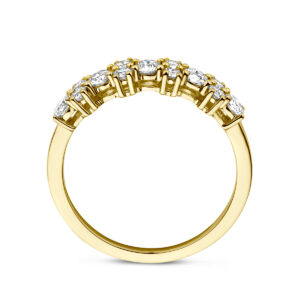 14k Geelgouden ring uitgevoerd met schitterende diamanten. De ring heeft een breedte van 5mm. Het diamantgewicht is 0.83ct.