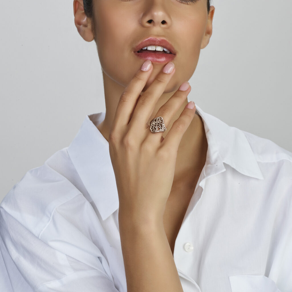 Gerhodineerd 925 zilveren filigrain ring met een breedte van 19.5mm.