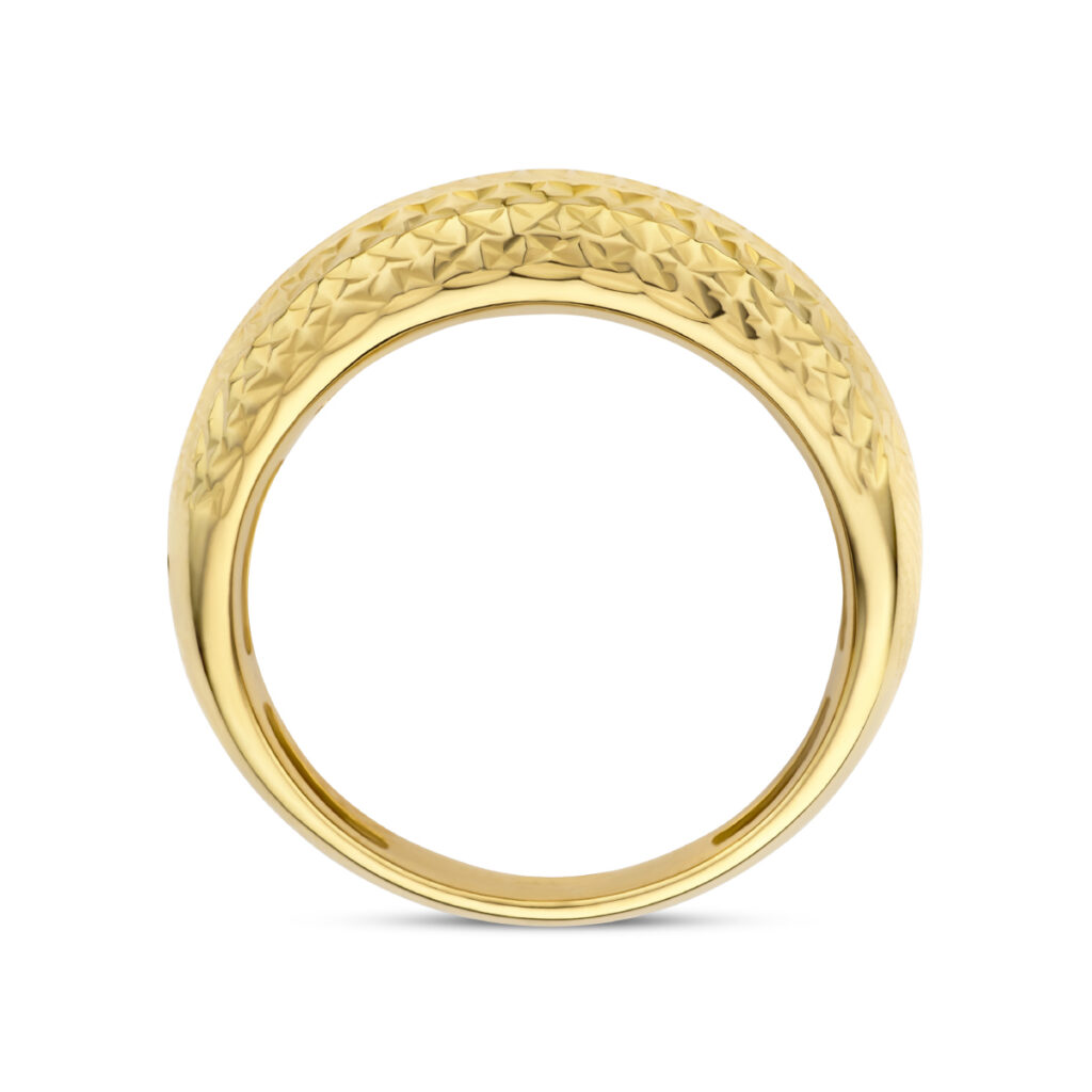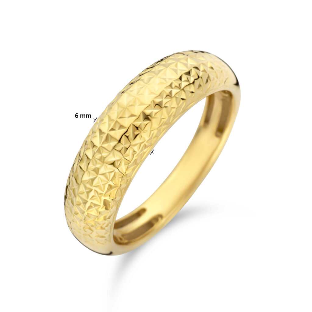14k Geelgouden ring met een gediamanteerde afwerking. De ring heeft een breedte van 6mm. De ring voelt comfortabel aan door de opengewerkte bodem.
