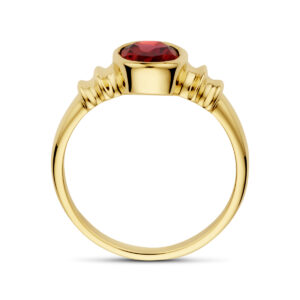 14k Geelgouden ring uitgevoerd met granaat. De ring heeft een breedte van 9mm.