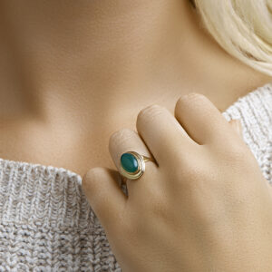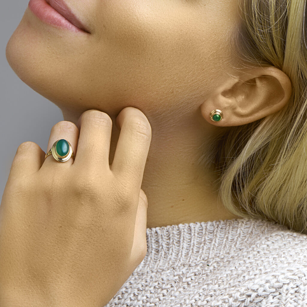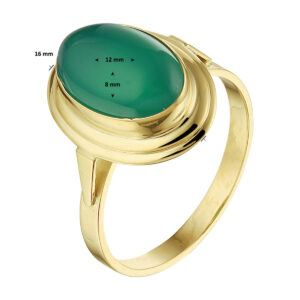Klassieke 14k geelgouden ring uitgevoerd met een schitterende groen agaat. De ring heeft een breedte van 16mm.