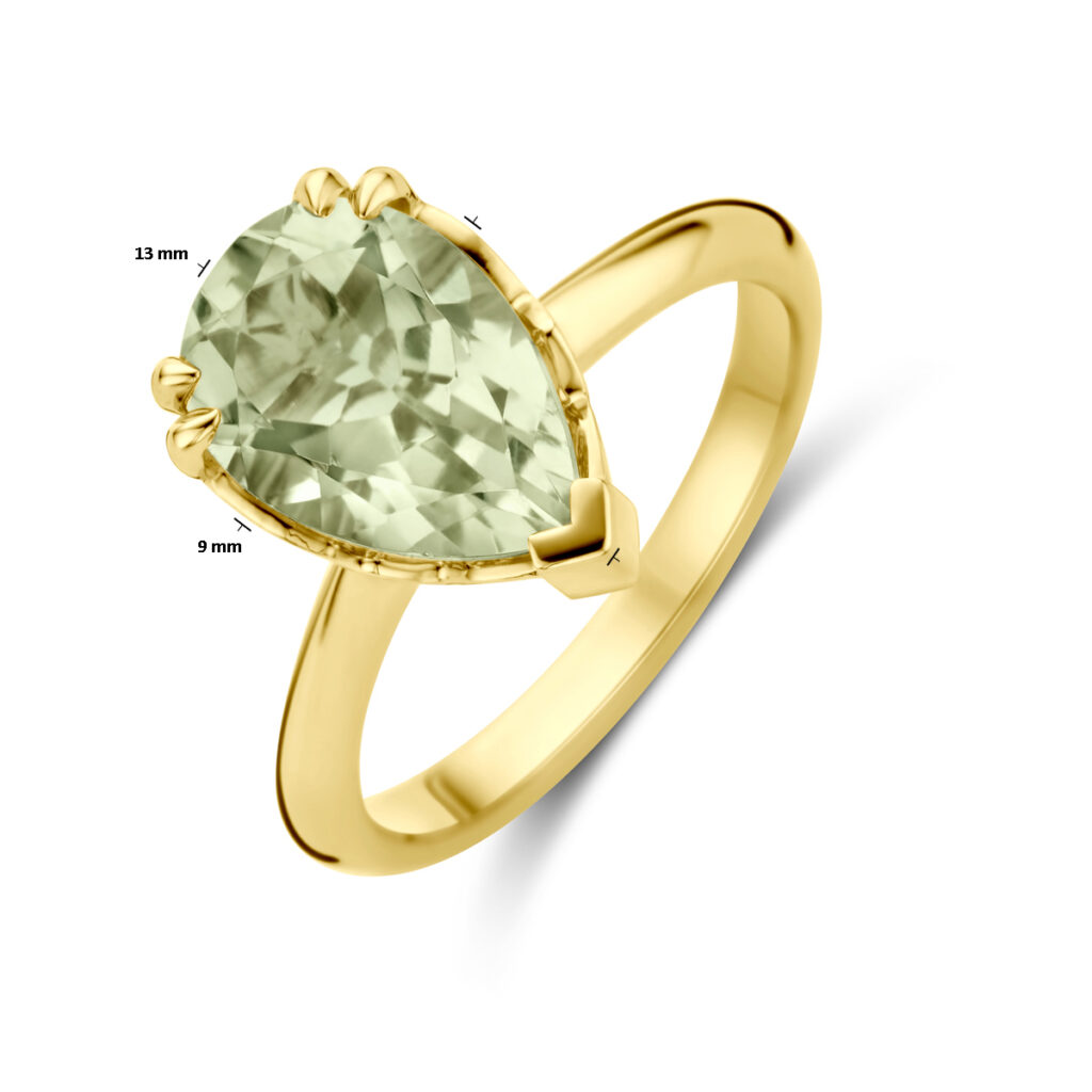 14k Geelgouden ring uitgevoerd met groen amethist. De ring heeft een afmeting van 13x9mm.